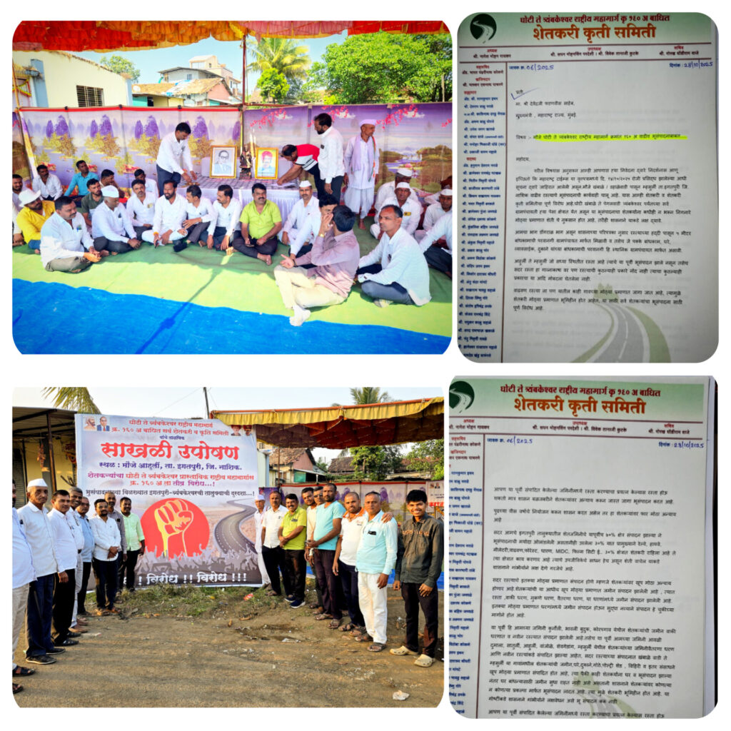 प्रतिनिधी :शिवनाथ घोटकर घोटी, दि. १४/११/२०२५, शेतकरी व शेतकरी कृती समितीचा पूर्ण विरोध आहे. घोटी खंबाळे ते पेगलवाडी त्र्यंबकेश्वर पर्यंतच्या सर्व ग्रामपंचायती ह्या पैसा क्षेत्रात येत असून या भूसंपादनाचा शेतकर्याना कधीही न भरून निगनारे मोठ्या प्रमाणात शेती चे नुकसान होत आहे, तरीही शासनाने याकडे लक्ष द्यावे.आमचा भाग डोंगराळ भाग असून शासनाच्या परिपत्रका नुसार रस्त्याच्या हद्दी पासून ५ मीटर बांधकामाची परवानगी ग्रामपंचायत मार्फत मिळावी व तसेच जे पक्के बांधकाम, घरे, व्यावसाईक, दुकाने यांच्या बांधकामाची परवानगी हि स्थानिक ग्रामपंचायत मार्फत असावी.आहुर्ली ते म्हसुर्ती जो सध्या स्थितीत रस्ता आहे, त्याचे या पूर्वी भूसंपादन झाले नसून तसेच सदर रस्ता हा गाव्नाकाषा वर पण रस्त्याची कुठल्याही प्रकारे नौद नाही त्याचा कुठल्याही प्रकारचा या आदि मोबदला घेतलेला नाही. वाढणाऱ्या रस्त्याबद्दल काही गावच्या मोठ्या प्रमाणात जागा जात आहे, त्यामुळे शेतकरी मोठ्या प्रमाणात भूमिहीन होत आहेत, या साठी सर्व शेतकऱ्यांचा भूसंपादना साठी पूर्ण विरोध आहेआपण या पूर्वी संपादित केलेल्या जमिनीमध्ये रस्ता करण्याचा प्रयत्न केल्यास रस्ता होऊ शकतो मात्र शासन बळजबरीने शेतकऱ्यांवर अन्याय करून जास्त जागा भूसंपादन करत आहे.पुढच्या वीस वर्षाचे नियोजन करून शासन करत असेल तर हा शेतकऱ्यांवर फार मोठा अन्याय आहे, यापूर्वी तालुक्यात एम.आय.डी.सी, धरणे,समृद्धी महामार्ग, रेल्वे, मुंबई नाशिक एक्सप्रेस, फिल्म सिटी , अशा अनेक ठिकाणी शेतकऱ्यांच्या शेतजमिनी गेले आहेत ,रस्त्याचे इतक्या मोठ्या प्रमाणात संपादन होणे म्हणजे शेतकऱ्यांवर खूप मोठा अन्याय होणार आहे. रस्त्याच्या संपादनात खंबाळे वाडी, ते म्हसुली या गावांमधील शेतकऱ्यांची जमीन, घरे, दुकाने, गोठे, पोल्ट्री शेड विहिरी व इतर संसाधने खूप मोठ्या प्रमाणात संपादित होत आहे, त्या पैकी काही शेतकर्यांना घर व भूसंपादन झाल्या नंतर घर बांधन्यासाठी जमीन सुधा राहत नाही, असे असतानी शासनाने शेतकऱ्यांवर कोणत्या न कोणत्या प्रकल्पा मार्फत भूसंपादन लादत आहे. त्या मुळे शेतकरी भूमिहीन होत आहे. या गोष्टीकडे शासनाने गांभीर्याने लक्षवेधन असे भू संपादन करू नाही, आजचे शेतकरी कृती समितीच्या वतीने आंदोलनात मुद्दे मांडण्यात आले, आले या वेळी उपस्थित, शेतकरी कृती समिती अध्यक्ष नागेश गायकर, सचिव गोरख वाजे, उपाध्यक्ष सपन परदेशीं, विवेक कुटके, सह सचिव AVD. भारत कोकणे, खजिनदार भास्कर पाचरणे, व सल्लागार समिती चे अरुण भाऊ पोरजे, उमेश खातळे,, AVD. हनुमंत मराडे, संपत वाजे, उपसभापती मार्केट कमेटी घोटी क्षीरसागर साहेब, किशन गायकर, श्याम गायकर सरपंच रामदास जमदाडे सरपंच,कुंडलिक जमदाडे द्