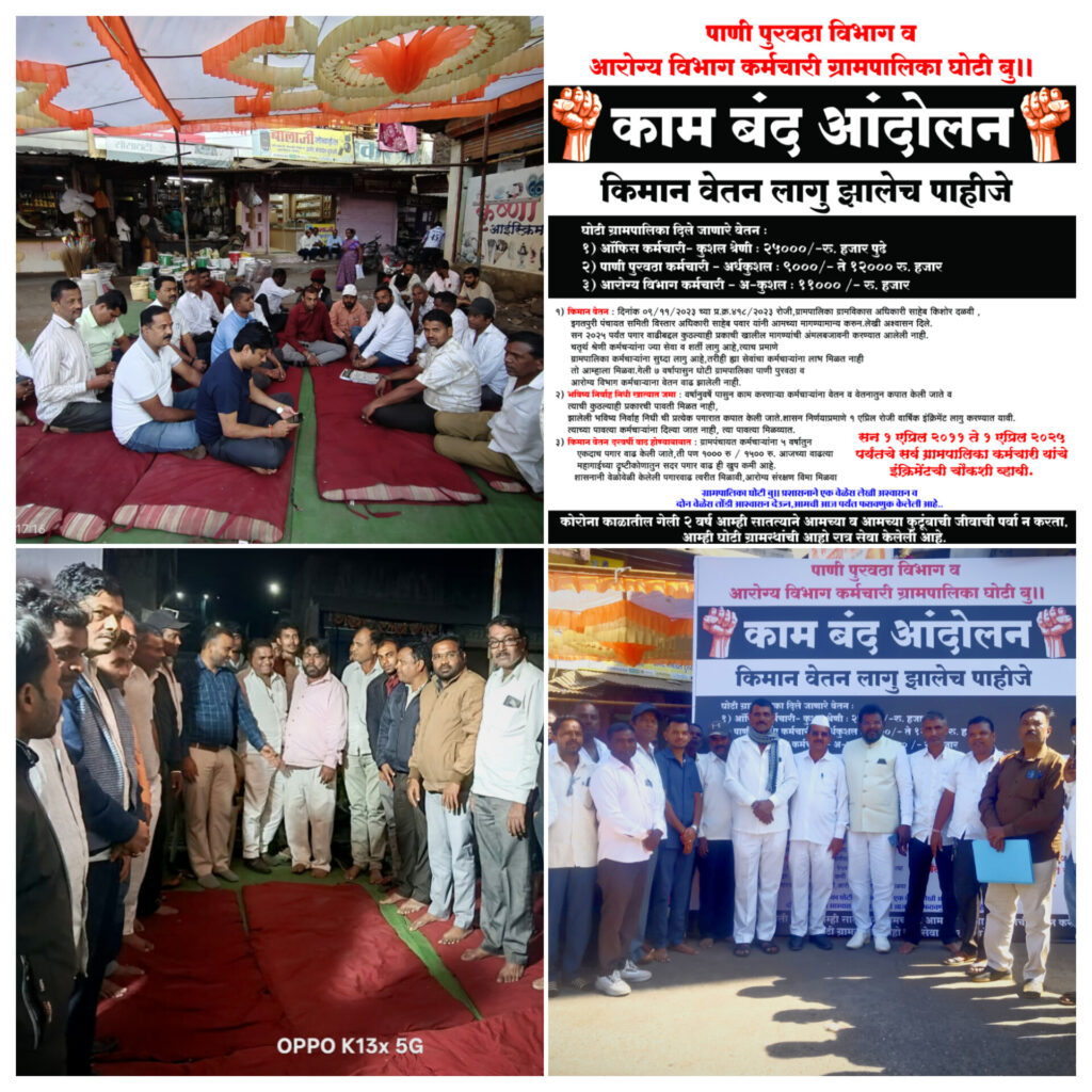 प्रतिनिधि शिवनाथ घोटकर.घोटी, दि.१७/१२/२०२५,घोटी ग्रामपालिका काम बंद आंदोलन या आंदोलनामध्ये आंदोलनामध्ये कर्मचाऱ्यांना पगार वाढ तसेच ठिकाणी भारतीय जनता पार्टी नाशिक जिल्हा सरचिटणीस महामंत्री साहेब डोंगरे अण्णासाहेब, समता परिषद अध्यक्ष शिवा भाऊ काळे, शिवसेना अध्यक्ष गणेश भाऊ काळे हिरामण कडू रामदास शेलार, यावेळेस कर्मचारी नेते. अध्यक्ष हिरामण धुमाळ, कमलाकर धोंगडे, शरद जाधव, दिलीप भाऊ, श्याम जाधव,अरुण मोकळ, अनेक कर्मचारी सर्व उपस्थित होते, यावेळी घोटी ग्रामपालिकेचे ग्रामसेवक डांगे भाऊसाहेब, विस्तार अधिकारी कराळे साहेब ,उपस्थित होते.यावेळी अण्णासाहेब डोंगरे, भारतीय जनता पार्टी नाशिक जिल्हा सरचिटणीस महामंत्री अनेक वर्षापासून काम करणारे, पहाटेपासून गाव स्वच्छ ठेवणाऱ्या सफाई कर्मचारी.व पाणीपुरवठा कर्मचारी यांना पर्मनंट पत्र देण्यात यावे, लवकरात लवकर आपण घोटी नगरपरिषद करणार आहे यावेळी ग्रामसेवक डांगे भाऊसाहेब, व कराळे भाऊसाहेब, विस्ताराधिकारी यांनी सांगितले की आपण सर्वांना त्यांच्या मुद्द्या नुसार त्यांना पत्र देऊ, या ठिकाणी आज काम बंद आंदोलन माग घेण्यात आले, तसेच मुख्य कार्यकारी अधिकारी यांच्याकडे. याबाबत कामगारांच्या समस्या बाबत विस्तार अधिकारी कराळे, व ग्रामसेवक डांगे साहेब, बोलणार आहेत, कामगारांच्या कामगारांच्या समस्या बाबत जिल्हाधिकारीव मुख्य कार्यकारी अधिकारी, व गटविकास अधिकारी,यांच्याशी बोलणार आहे, घोटी ग्रामपालिका निवडणूक झाल्यानंतर सर्व कामगारांना पगार वाढ करून देणार आहे. असे प्रशासक बोलले आहे, तसेच वंचित बहुजन आघाडी मंगळवार दिनांक 16 रोजी जाहीर पाठिंबा दिला, यावेळी उपस्थित वंचित बहुजन आघाडी तालुका अध्यक्ष शरद सोनवणे, आणि अनेक पदाधिकारी उपस्थित होते, आज बुधवार दिनांक 17 रोजी सकाळी या संदर्भात शिवा भाऊ काळे, समता परिषद अध्यक्ष तसेच भाजपा जिल्हा महामंत्री अण्णासाहेब डोंगरे, सामाजिक नेते पांडुरंग शिंदे, गणेश काळे, मा. सरपंच रामदास शेलार,व पांडुरंग भगत, हिरामण कडून, गोपाळ शिंदे, मुन्नाभाई शेख, यांनी.मध्य स्थिती घडवून सादर आंदोलन यशस्वी केले यावेळी अनेक वर्षापासून काम करणारे. कामगारांना परमनंट पत्र देण्यात यावे ही मागणी मंजूर करण्यात आली व त्याला यश पण आले सर्वांना उद्या पत्र भेटणार आहे, कामगारांच्या एकजुटीचा विजय असो छत्रपती शिवाजी महाराज की जय, डॉक्टर बाबासाहेब आंबेडकराचा विजय असो, अशा घोषणा देऊन आंदोलन मागे घेण्यात आले,